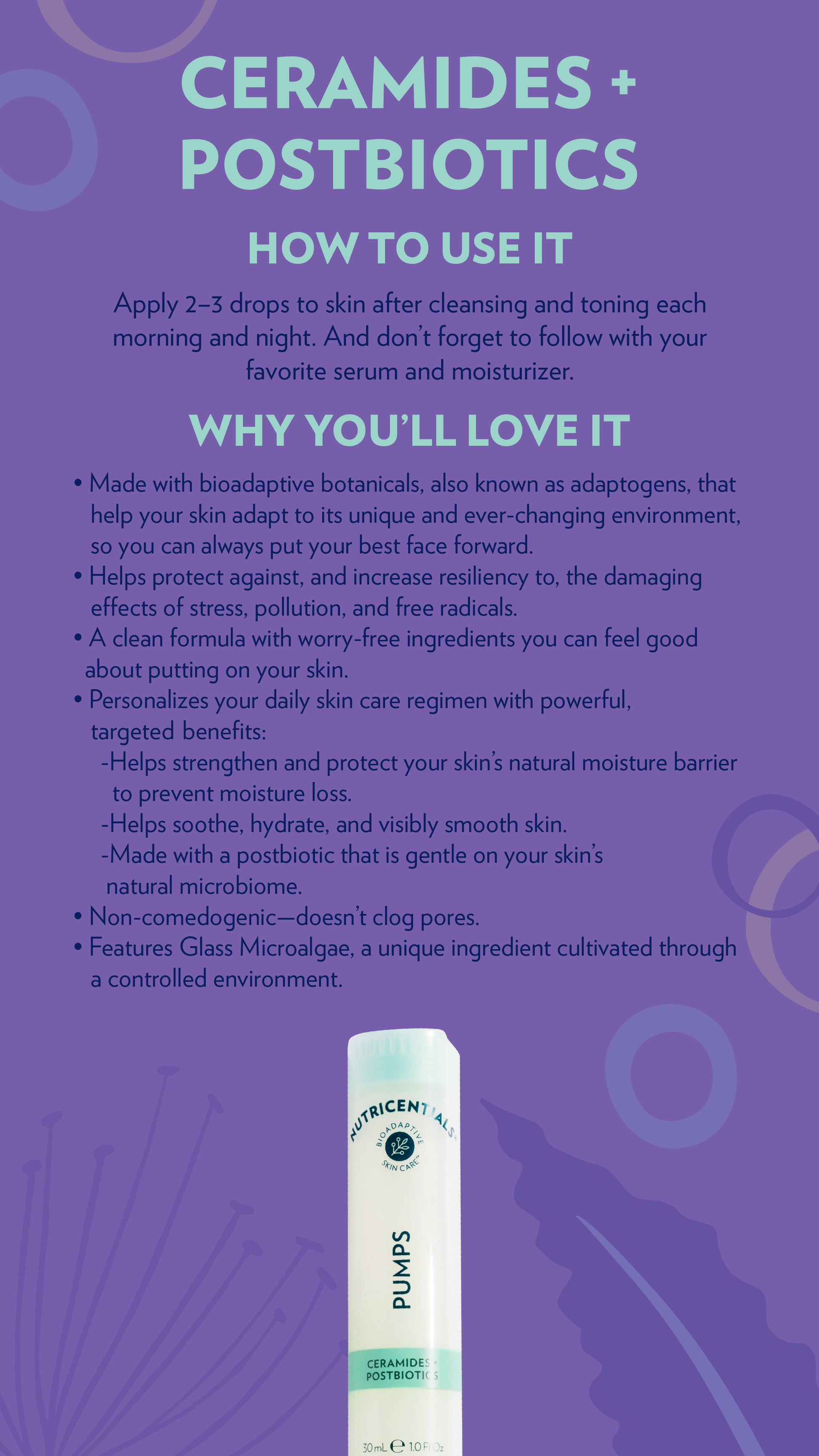Our Nutricentials Pumps Ceramides + Postbiotics fortifying formula, made with worry-free ingredients, helps protect against, and increase resiliency to, everyday stressors thanks to our Bioadaptive Botanical Complex. At the same time, a blend of three skin-identical ceramides, specially sourced Glass Microalgae, and Lactobacillus Ferment (a postbiotic that’s gentle on your skin’s natural microbiome) all work together to protect and strengthen your skin’s vital moisture barrier. And to top things off, Ectoin, Apple Extract, and an Amino Acid Blend add a burst of extra hydration, helping soothe and visibly smooth your skin for a gorgeous finish.