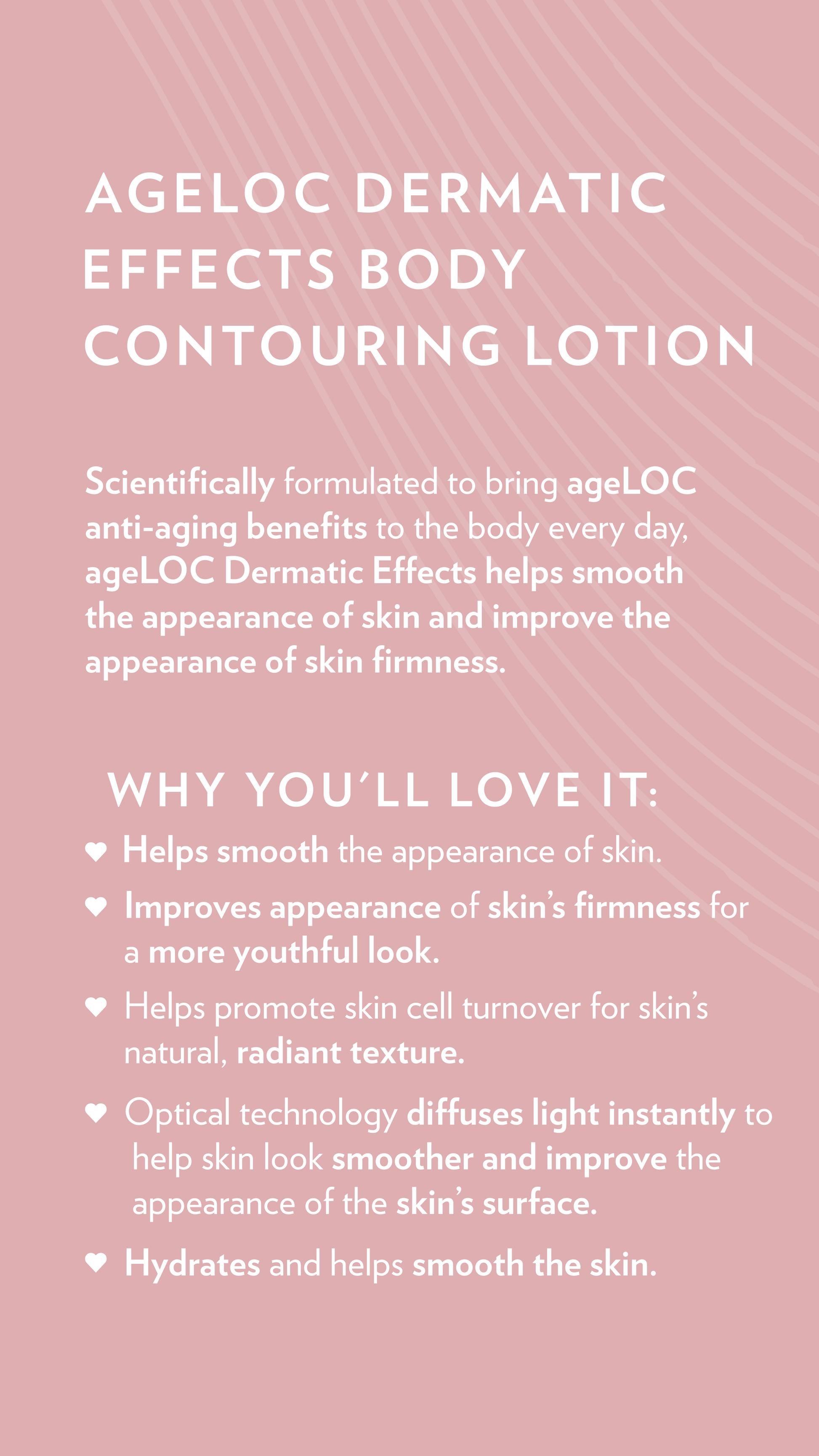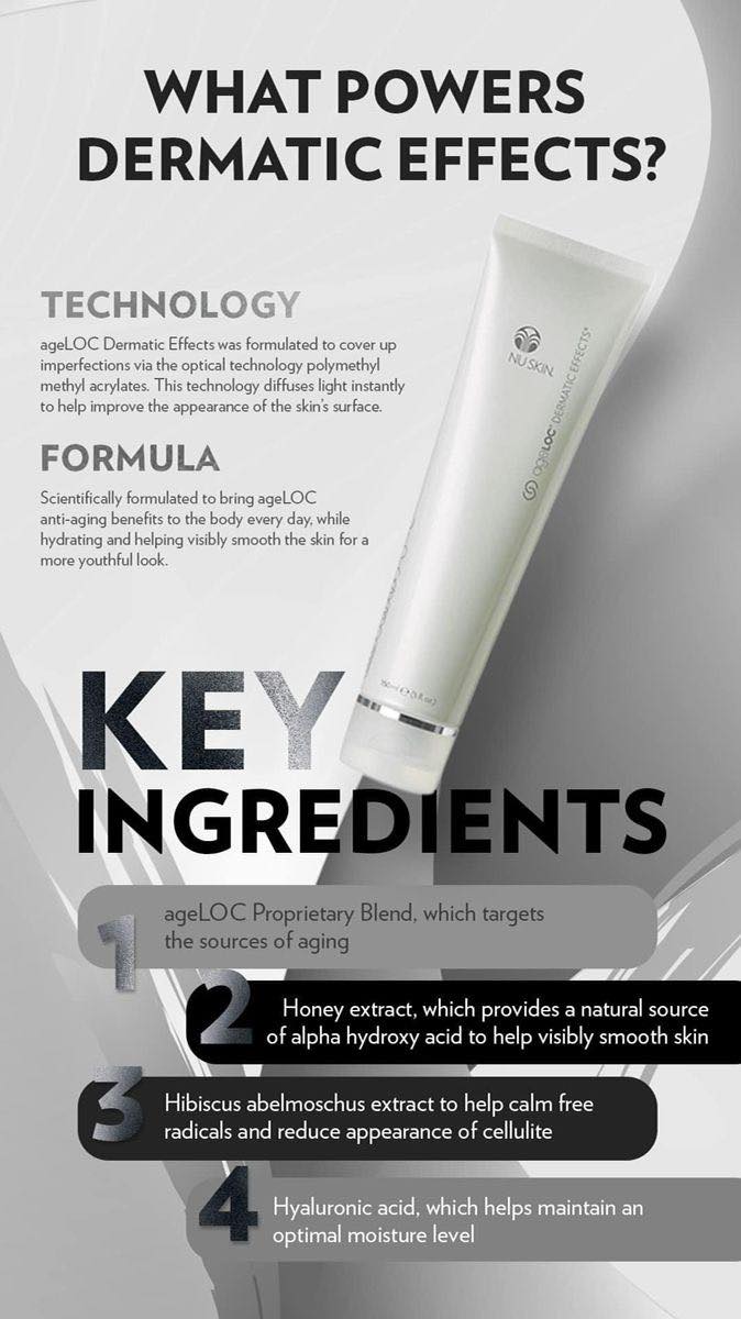 AgeLOC Dermatic Effects is a scientifically designed contouring moisturizer that can help visibly smooth the appearance of fat and cellulite and visibly firm skin. This daily skin smoothing lotion helps visibly contour, hydrate, and bring youth-renewing benefits to your body.