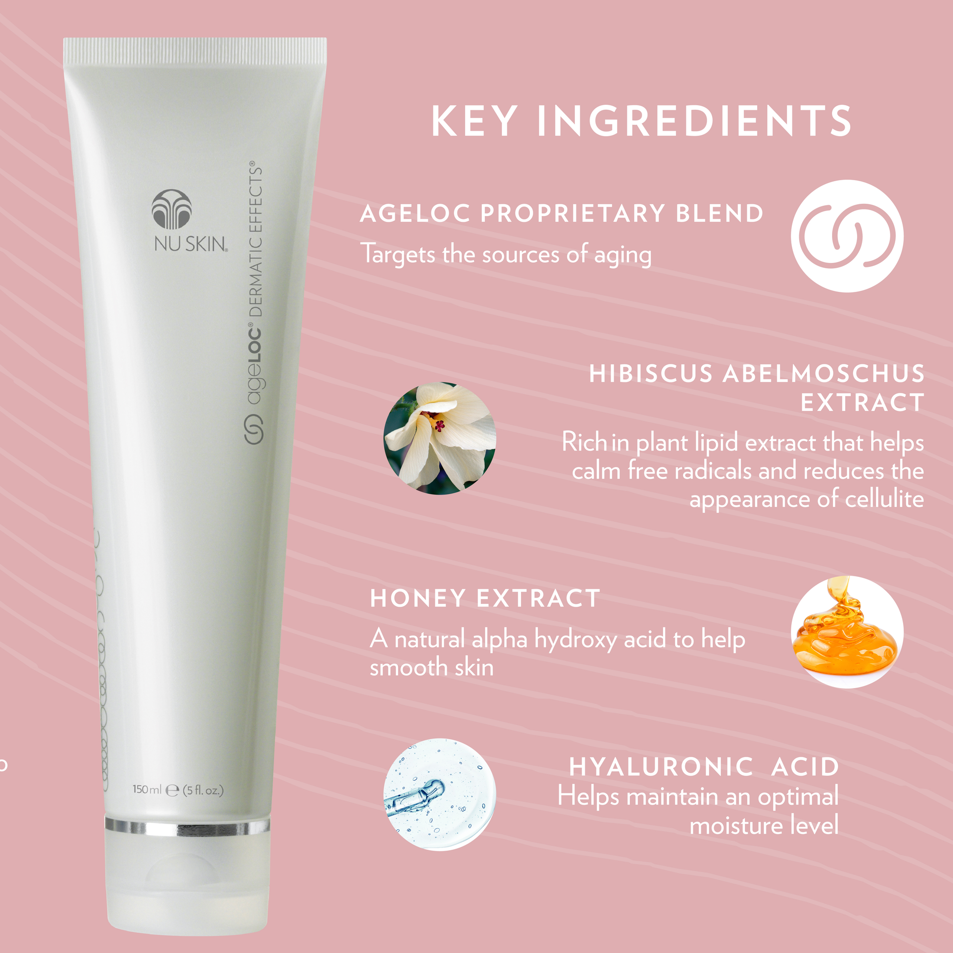 - Hibiscus abelmoschus extract—rich in plant lipid extract that helps calm free radicals and reduces the appearance of cellulite. • Honey extract—a natural alpha hydroxy acid to help smooth skin.