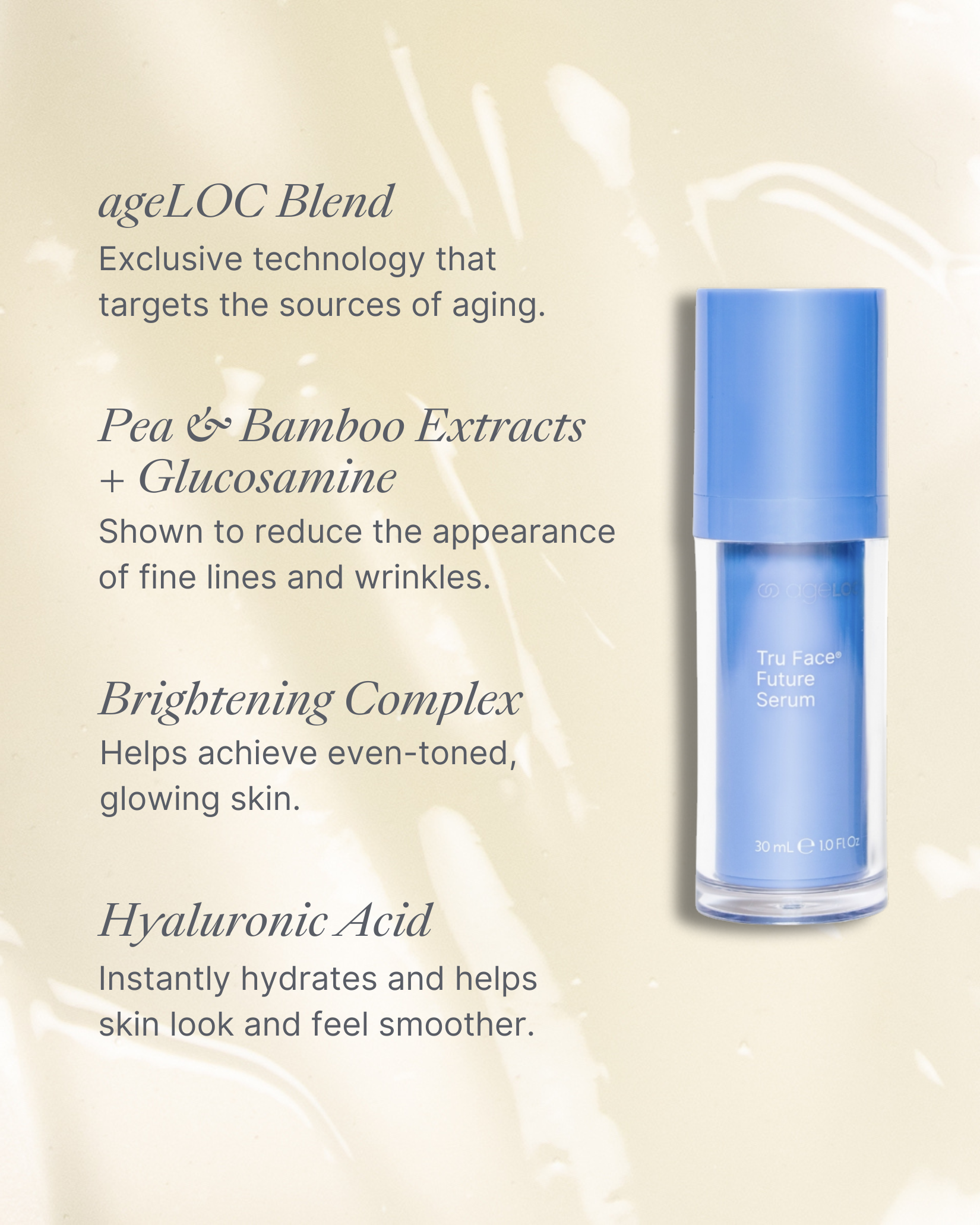 This powerful, clinically proven formula made with 15% active ingredients to give you clinical-strength results at home, revealing visibly improved skin, eight ways in just seven days: firmness, smoothness, skin tone evenness, fine lines/wrinkles, radiance, pore appearance, discoloration, and hydration. Future Serum is a multitasking game changer, part of ageLOC Tru Face, Nu Skin’s first dermaceutical skin care line.