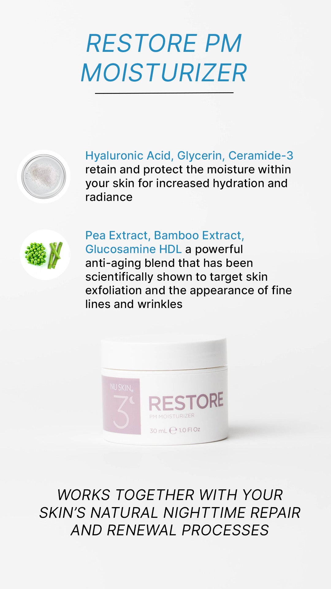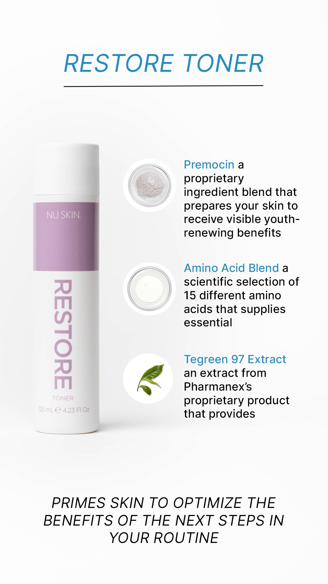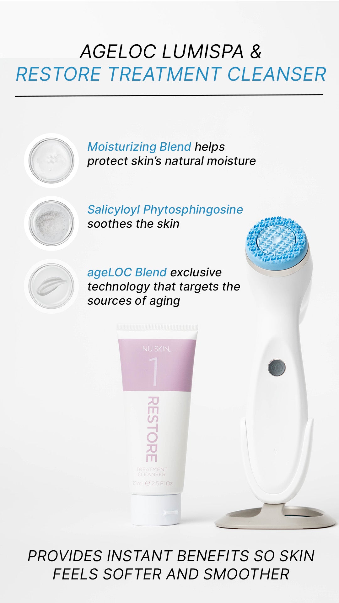 Restore, refresh, renew—all for a youthful-looking you. With Nu Skin’s Restore Line, you can experience visibly healthier, brighter skin as easy as 1, 2, 3. This simple, twice-daily system starts with our award winning ageLOC® LumiSpa® iO device* and Restore Treatment Cleanser to help you get that radiant glow you deserve. Follow with multitasking Restore Toner to help prep skin and promote a youthful-looking complexion, then powerful Restore Serum formulated to help minimize the appearance of fine lines and wrinkles and deliver a more even-looking skin tone. Finish off with the silky-smooth, SPF-powered Restore AM Moisturizer to improve skin brightness or the rich Restore PM Moisturizer to help promote youthful skin cell turnover so you can wake up to a healthier looking, vibrant complexion. Go get your glow with the right-for-you Restore Line— only from Nu Skin.