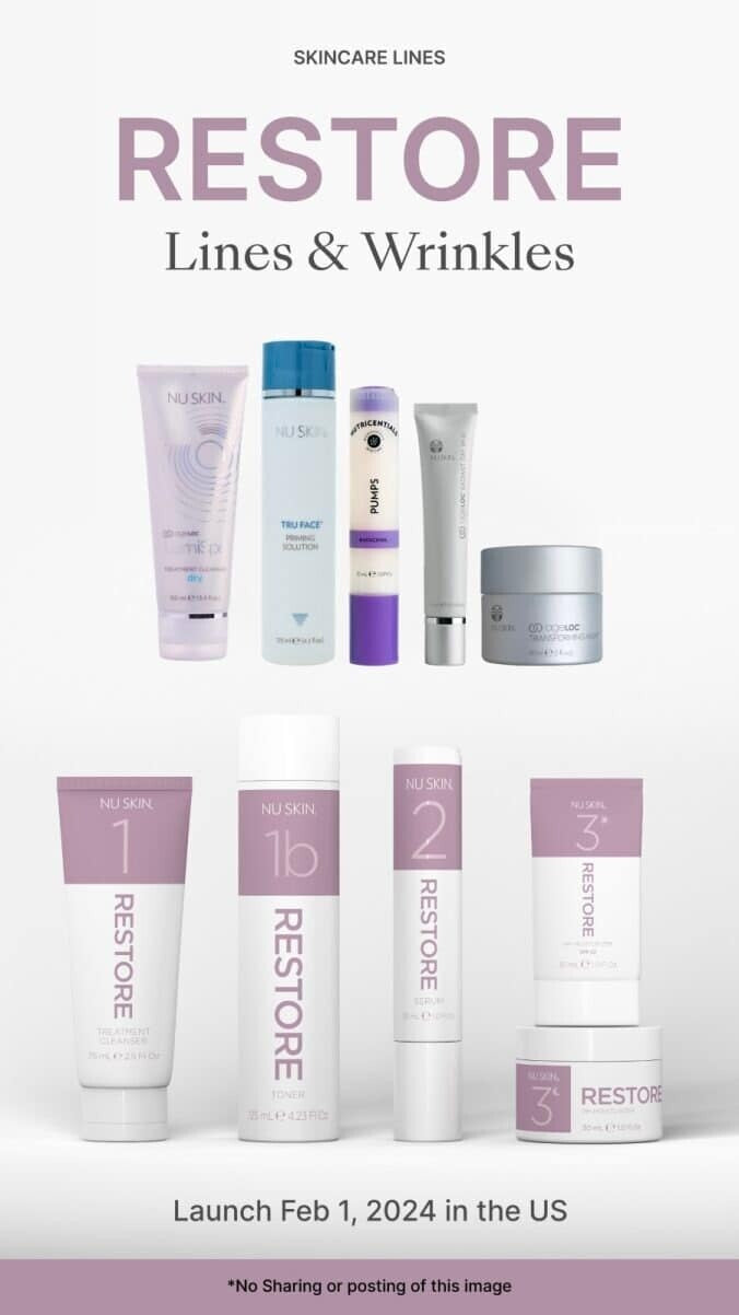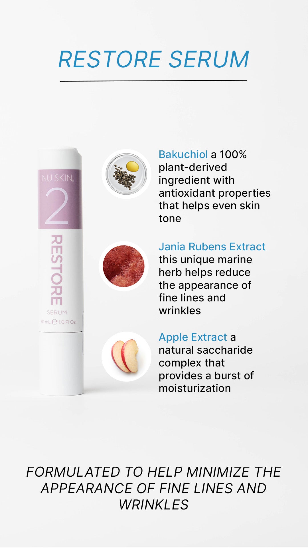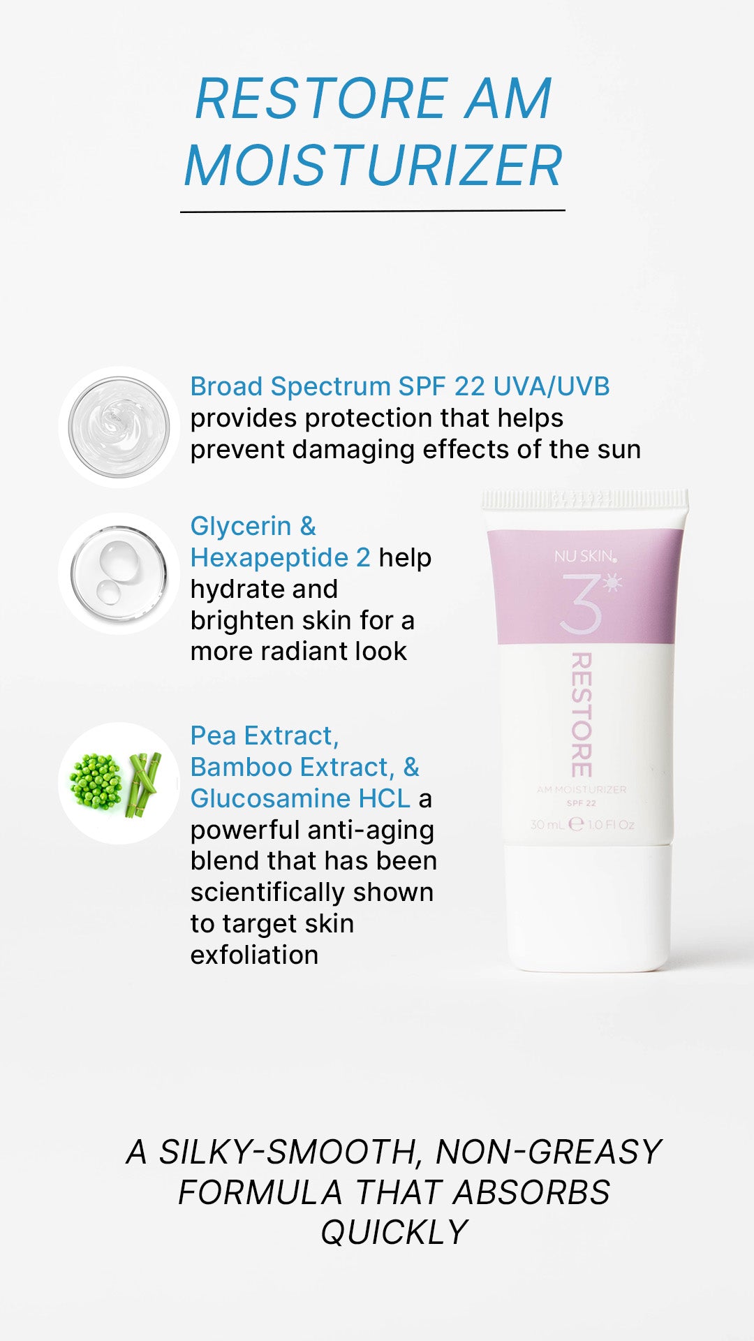 Restore, refresh, renew—all for a youthful-looking you. With Nu Skin’s Restore Line, you can experience visibly healthier, brighter skin as easy as 1, 2, 3. This simple, twice-daily system starts with our award winning ageLOC® LumiSpa® iO device* and Restore Treatment Cleanser to help you get that radiant glow you deserve. Follow with multitasking Restore Toner to help prep skin and promote a youthful-looking complexion, then powerful Restore Serum formulated to help minimize the appearance of fine lines and wrinkles and deliver a more even-looking skin tone. Finish off with the silky-smooth, SPF-powered Restore AM Moisturizer to improve skin brightness or the rich Restore PM Moisturizer to help promote youthful skin cell turnover so you can wake up to a healthier looking, vibrant complexion. Go get your glow with the right-for-you Restore Line— only from Nu Skin.